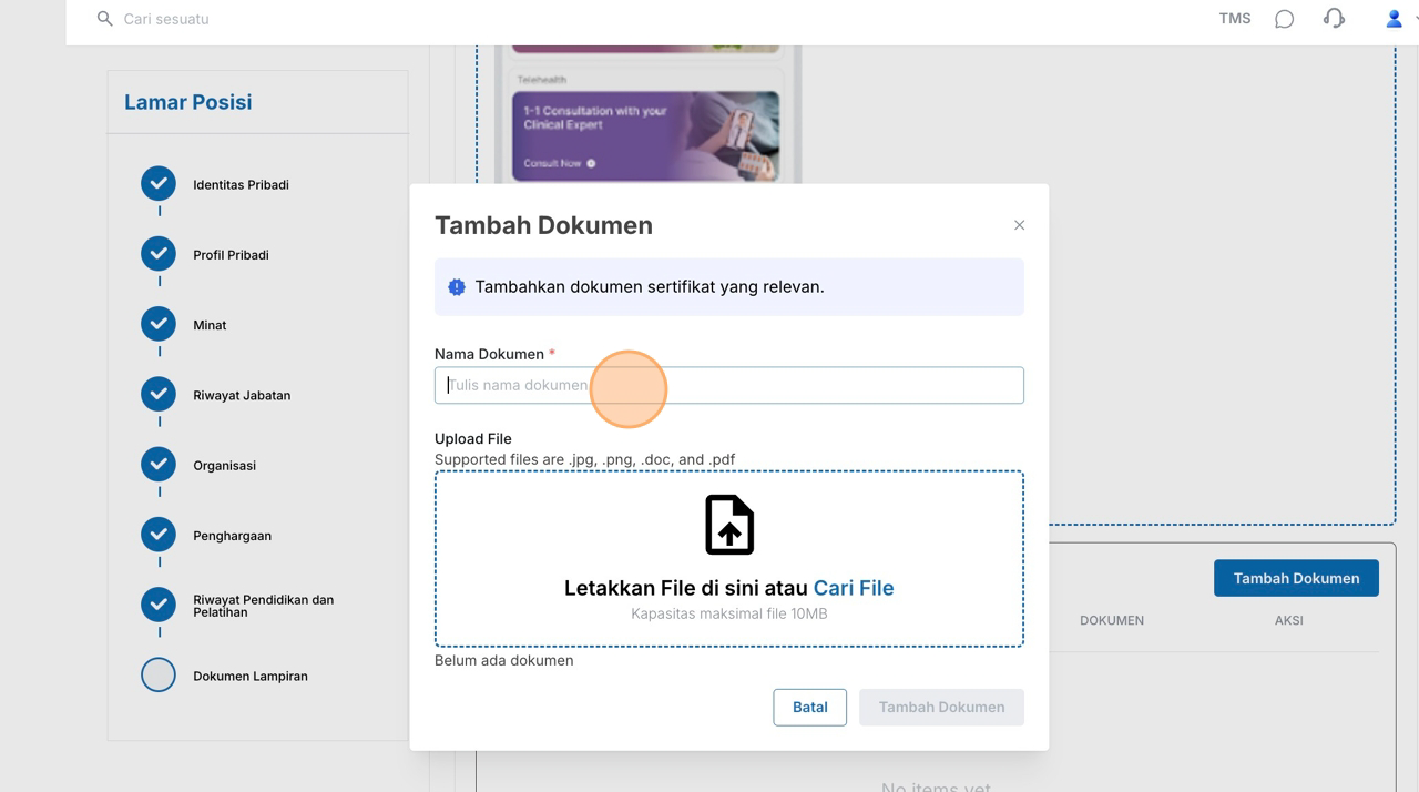 27. Jika Anda memiliki dokumen sertifikat dan sebagainya, Anda dapat melampirkan dokumennya dengan mengeklik **Tambah Dokumen**
