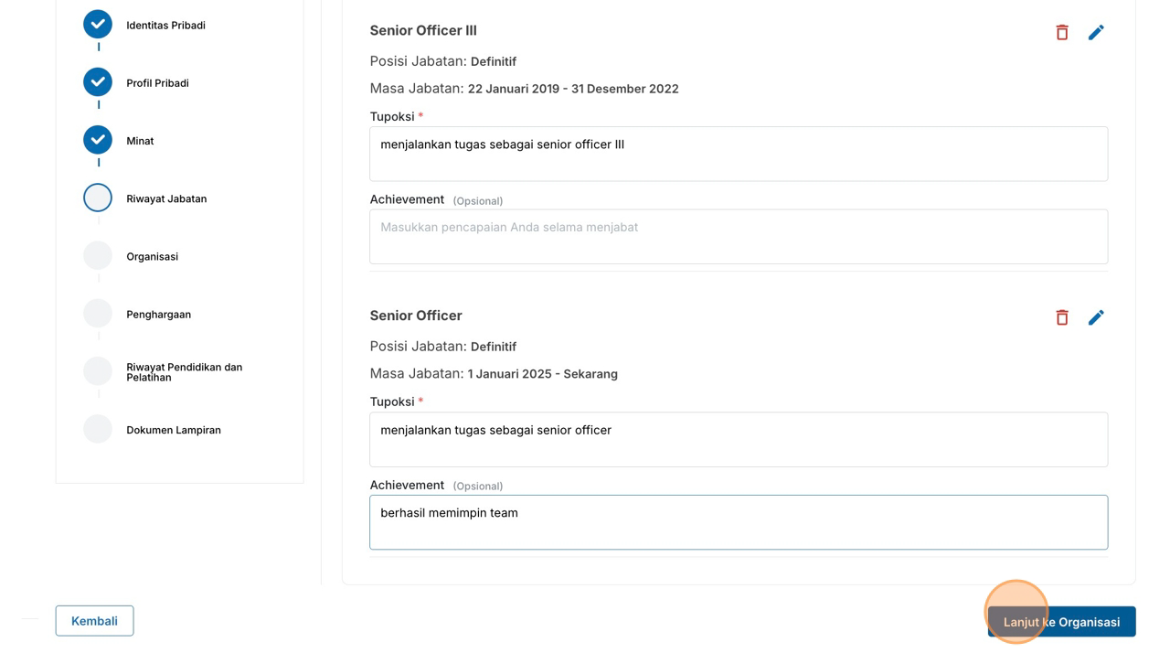 9. Jika sudah, klik **Lanjut ke Riwayat Jabatan**