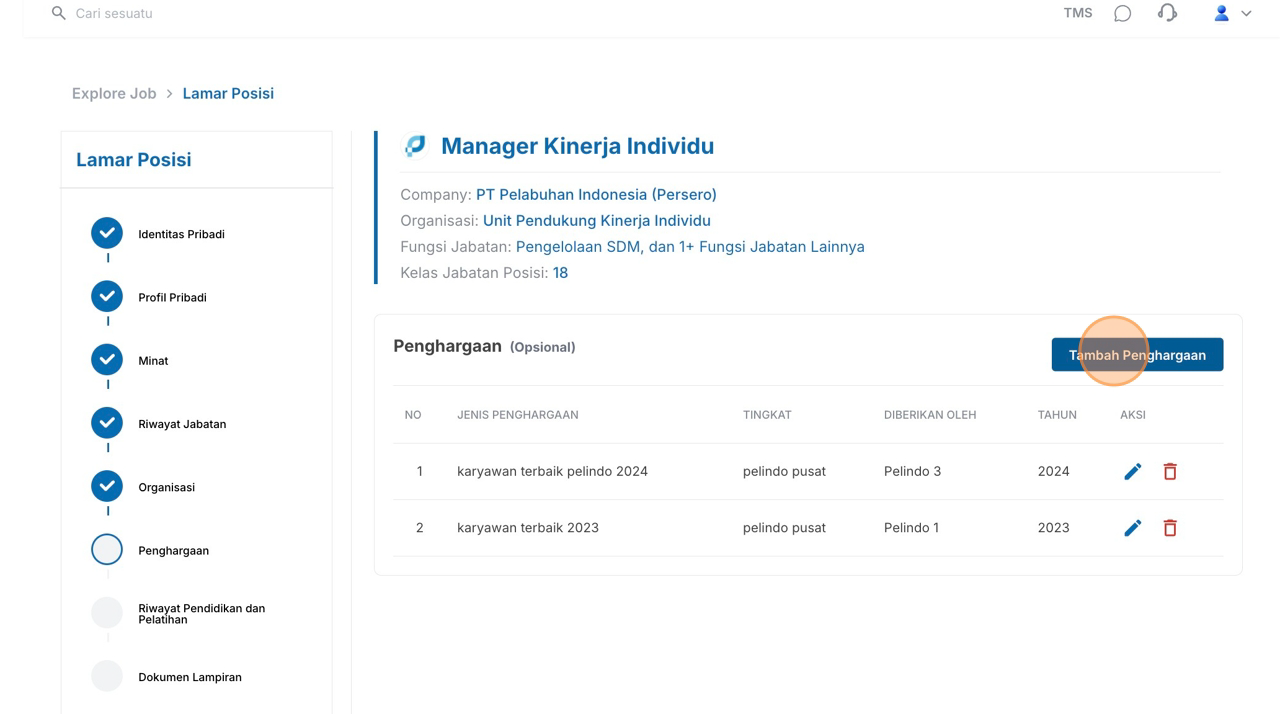20. Isikan data organisasi yang pernah Anda ikuti, klik **Tambah Penghargaan**